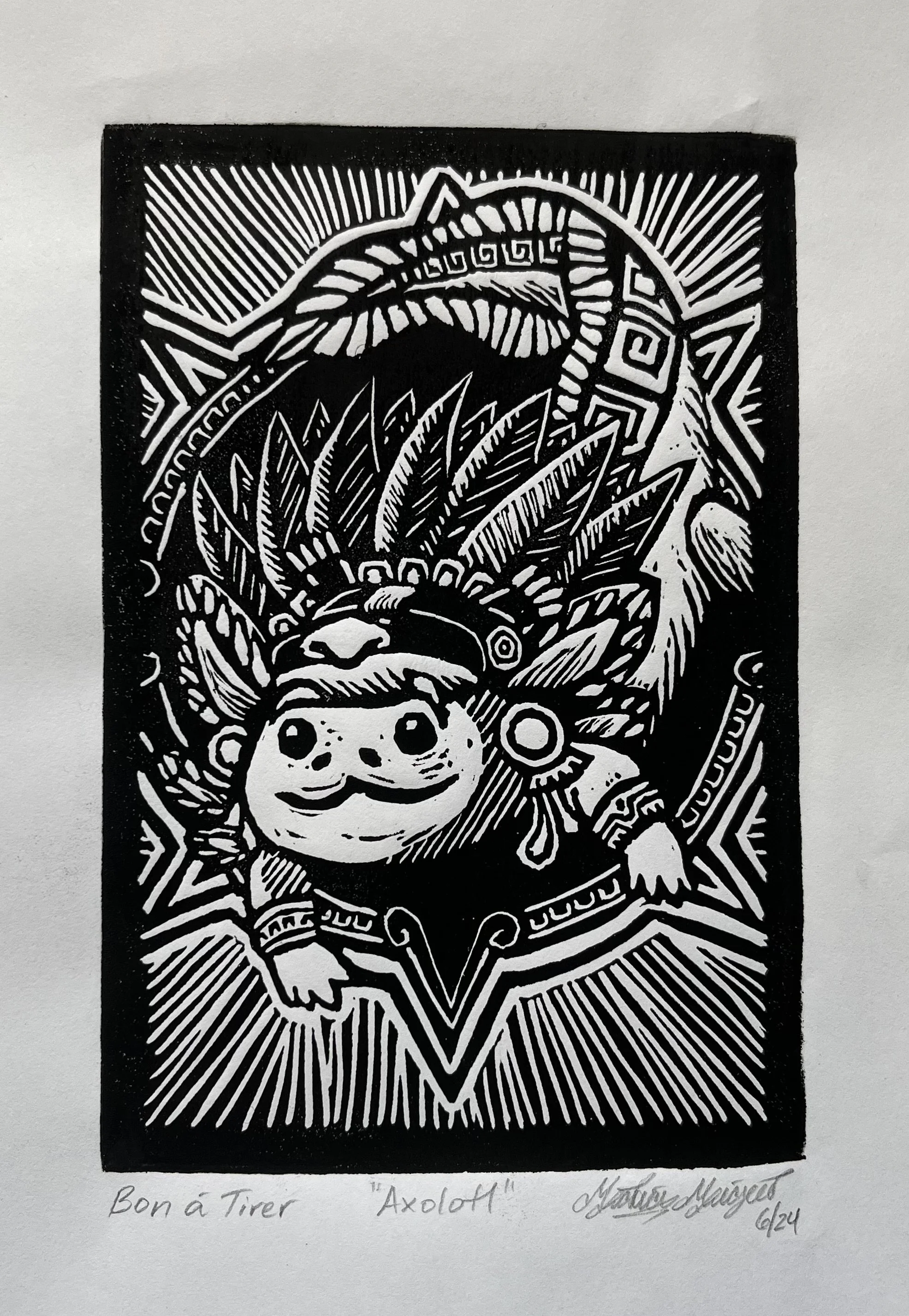 Printmaking Memento Morii - Relief Print (2023) Vector - Screenprint (2023) Happenchance - Intaglio Print (2023) Macaws - Relief Print (2023) Axolotl - Relief Print (2024)